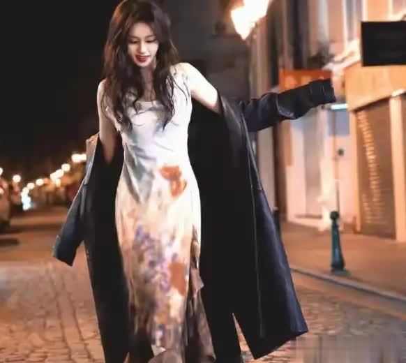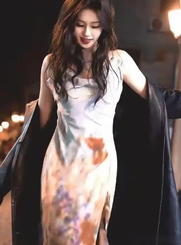 照片里她裹着一件哑光黑皮大衣,领口翻出暗红内衬,下身却套了条印花吊带裙,粉紫渐变的迷幻花朵直接糊满裙摆,腰间还系了条同色系细腰带。